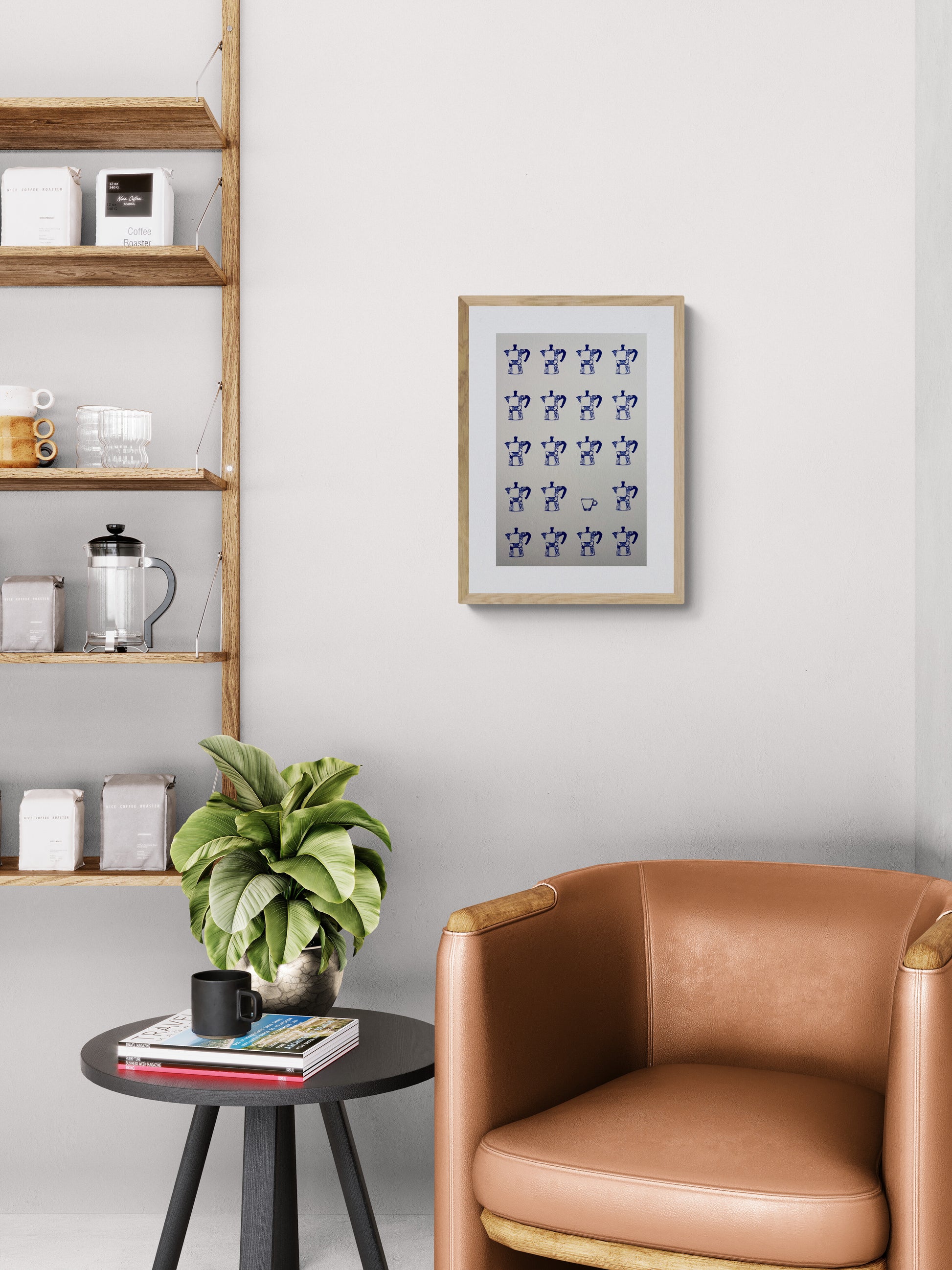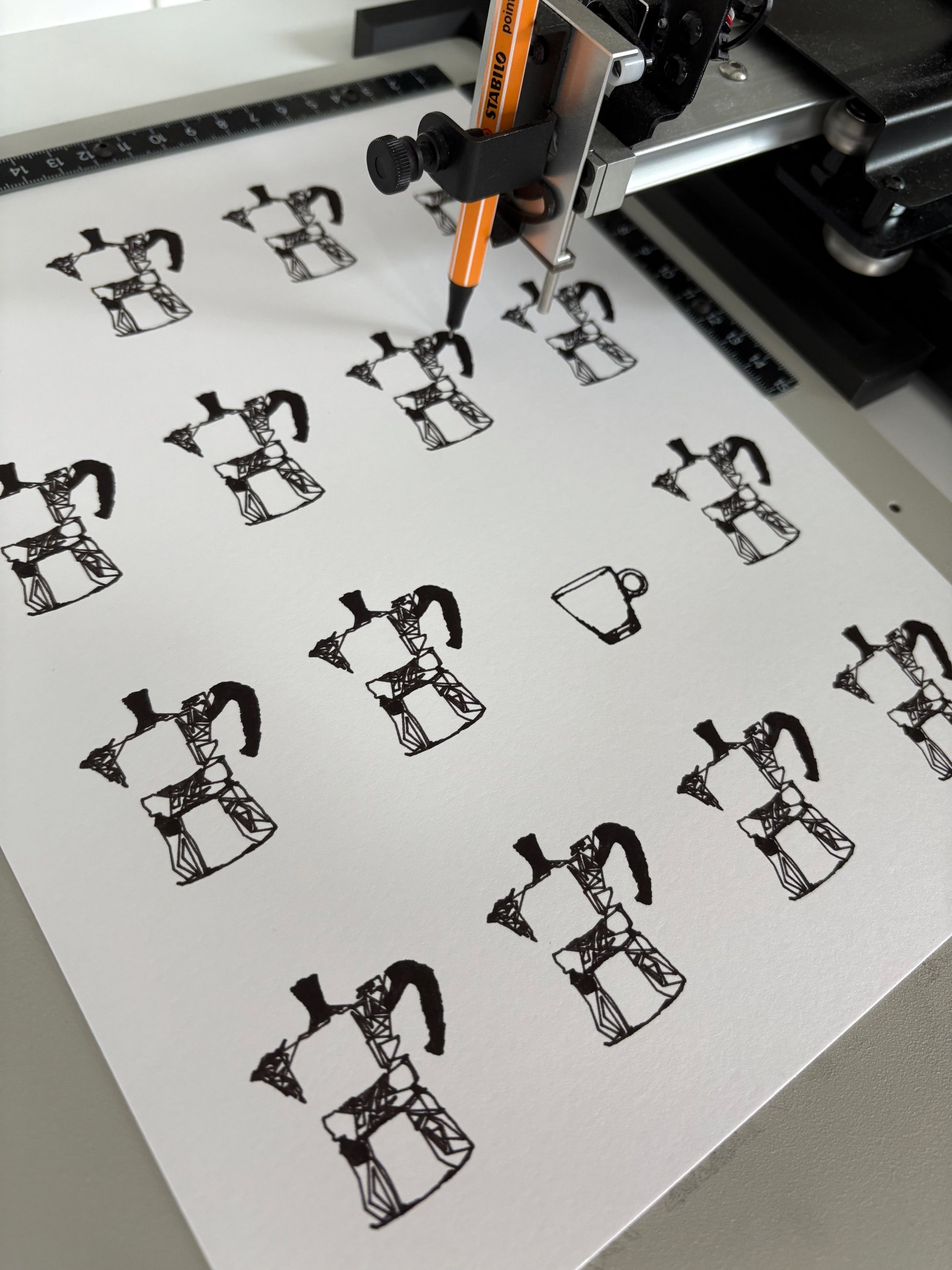 A structured grid of moka pots, with a single espresso cup subtly breaking the repetition. This work was designed in-house and each drawing is made individually using real ink pens and a plotter, resulting in slight variations that make every piece unique.